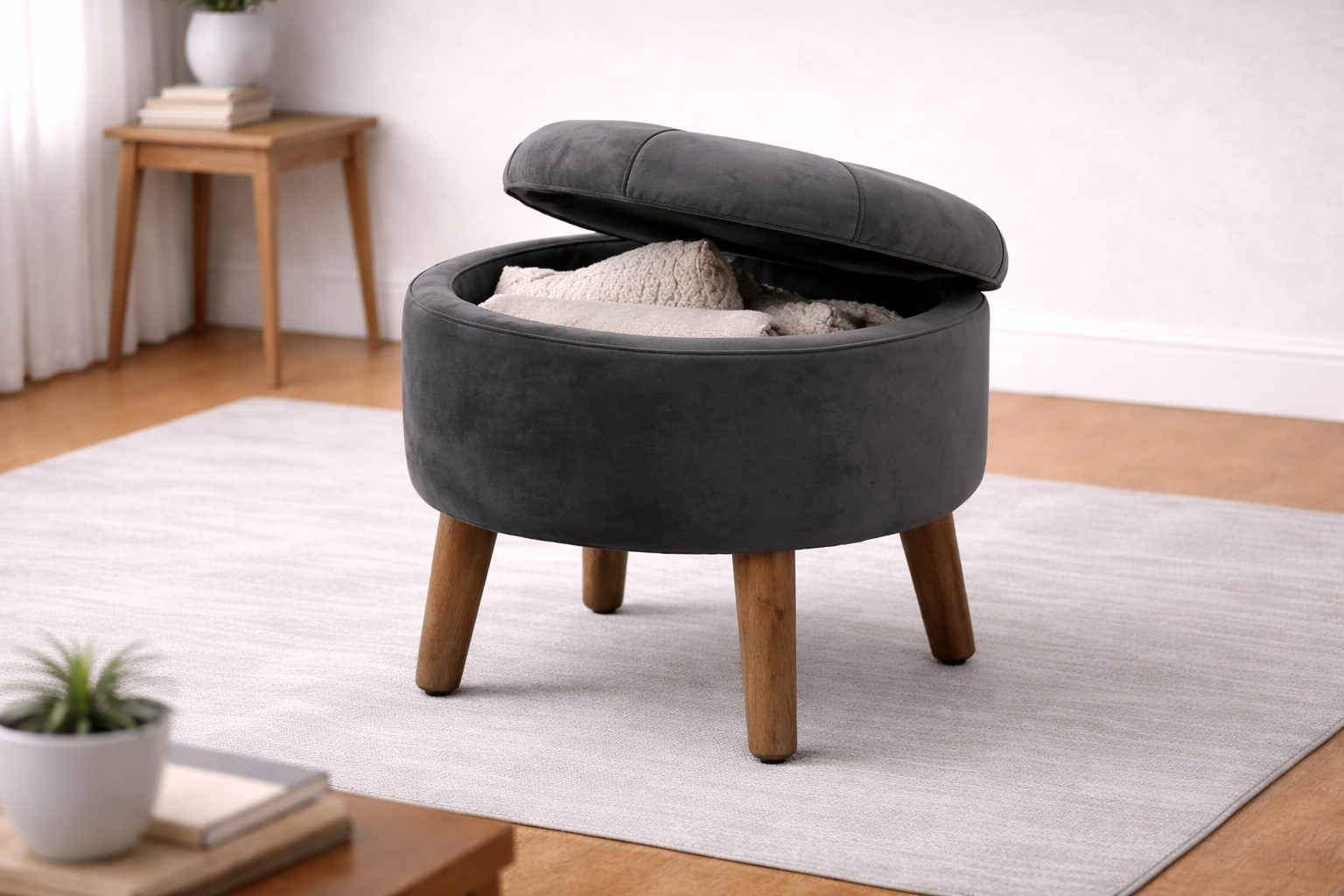 The Upholstered Puff with Wooden Legs and Storage is a functional and stylish accent piece designed to add comfort, convenience, and elegance to modern interiors. Featuring a softly upholstered top with integrated hidden storage and supported by sturdy wooden legs, this puff offers both seating comfort and practical storage in a compact form.
