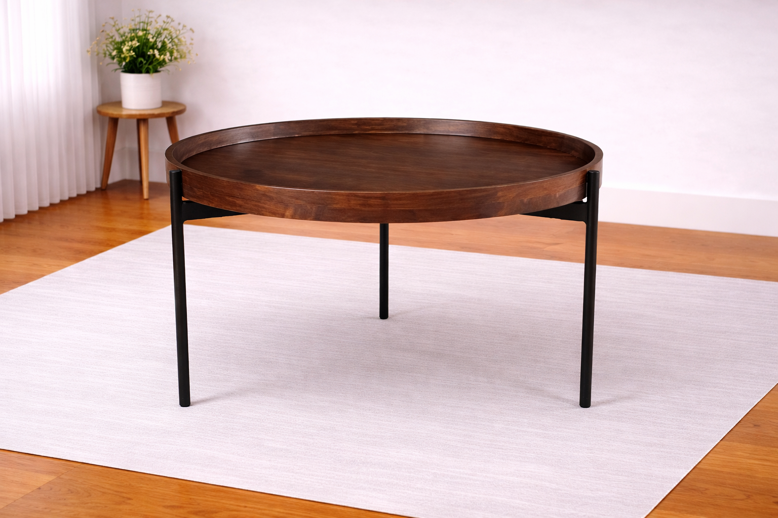 A contemporary centre table featuring a solid wooden top paired with a strong iron base. Designed for durability and modern aesthetics, this table adds warmth and character to living spaces while maintaining a sleek industrial appeal.